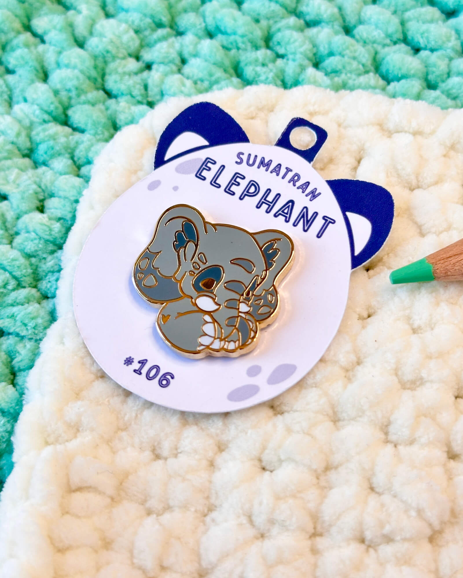 A cute enamel pin featuring a sumatran elephant.