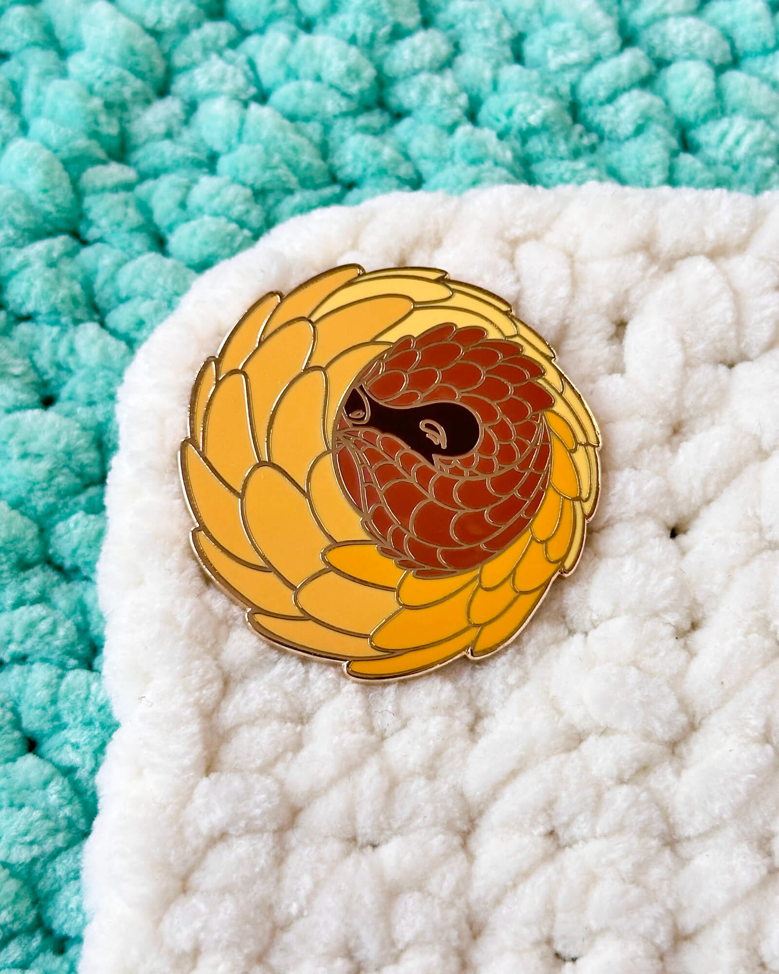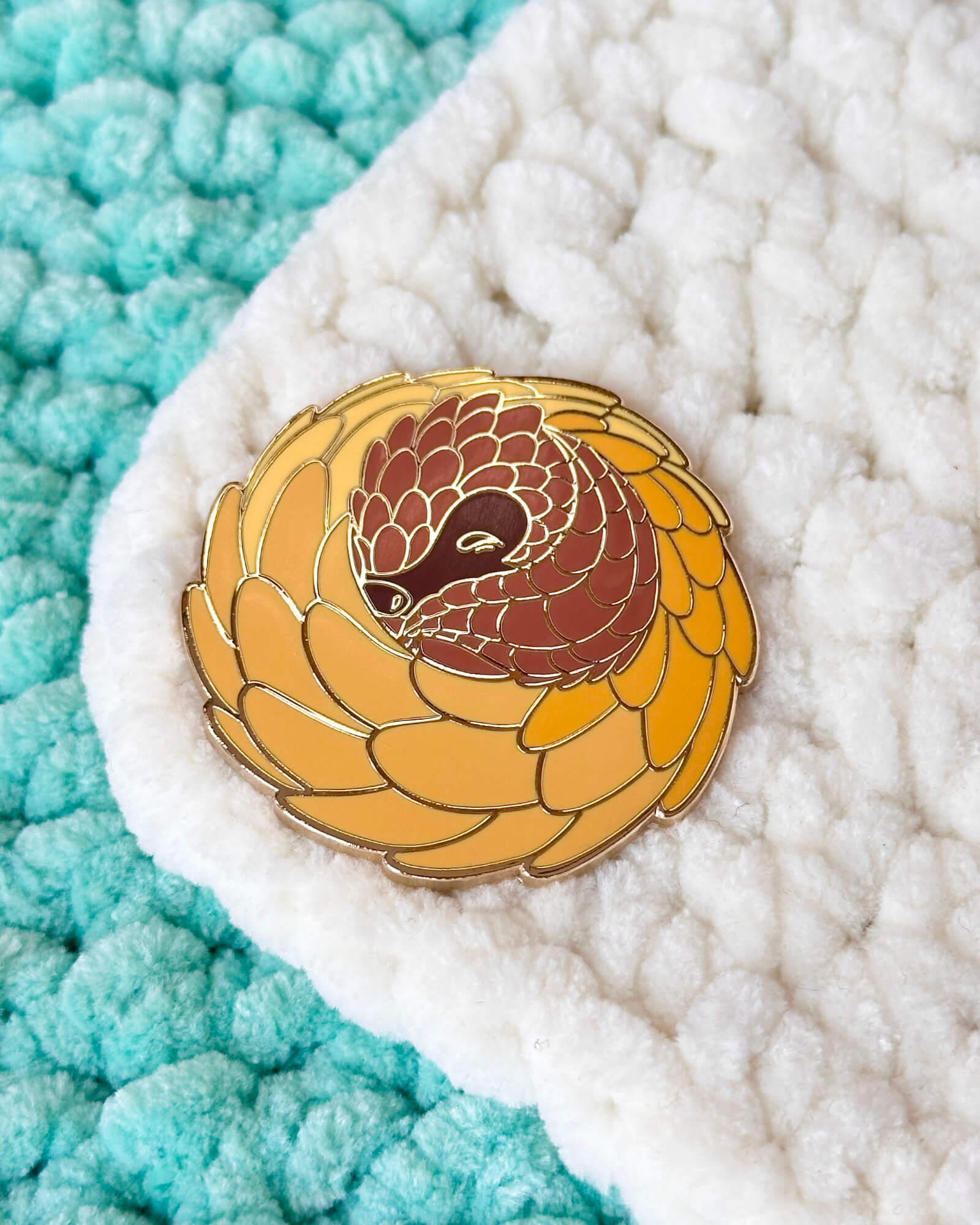 A lovely enamel pin featuring a sunflower pangolin.