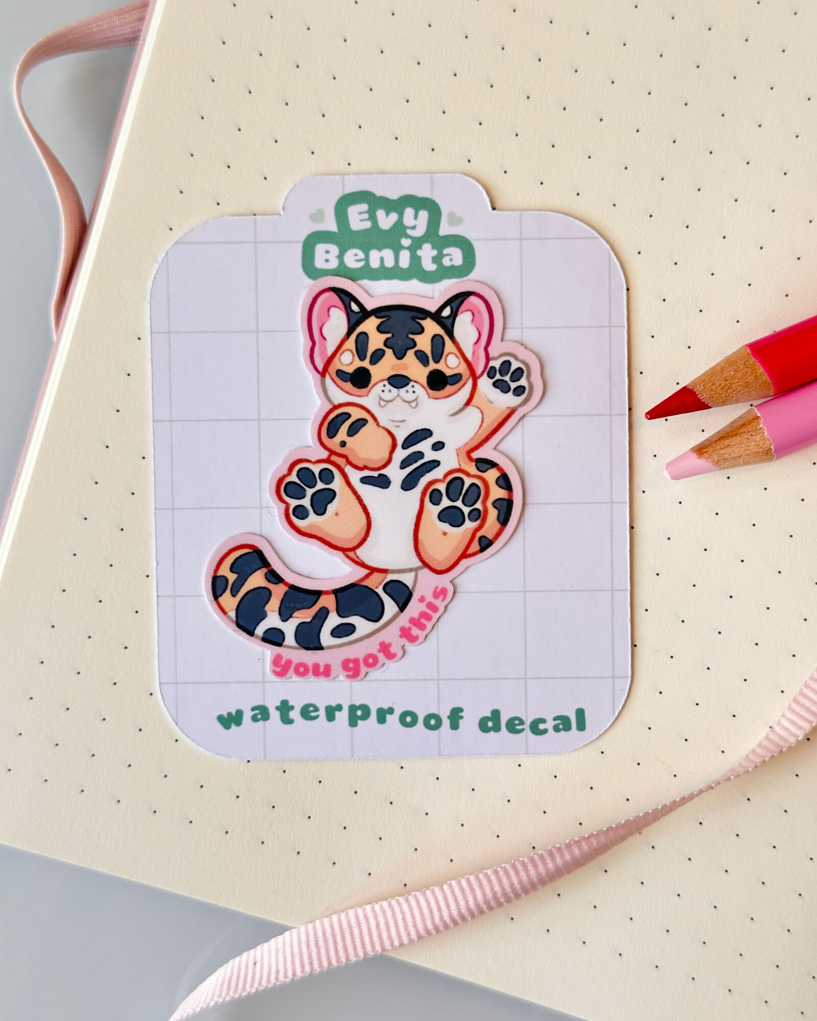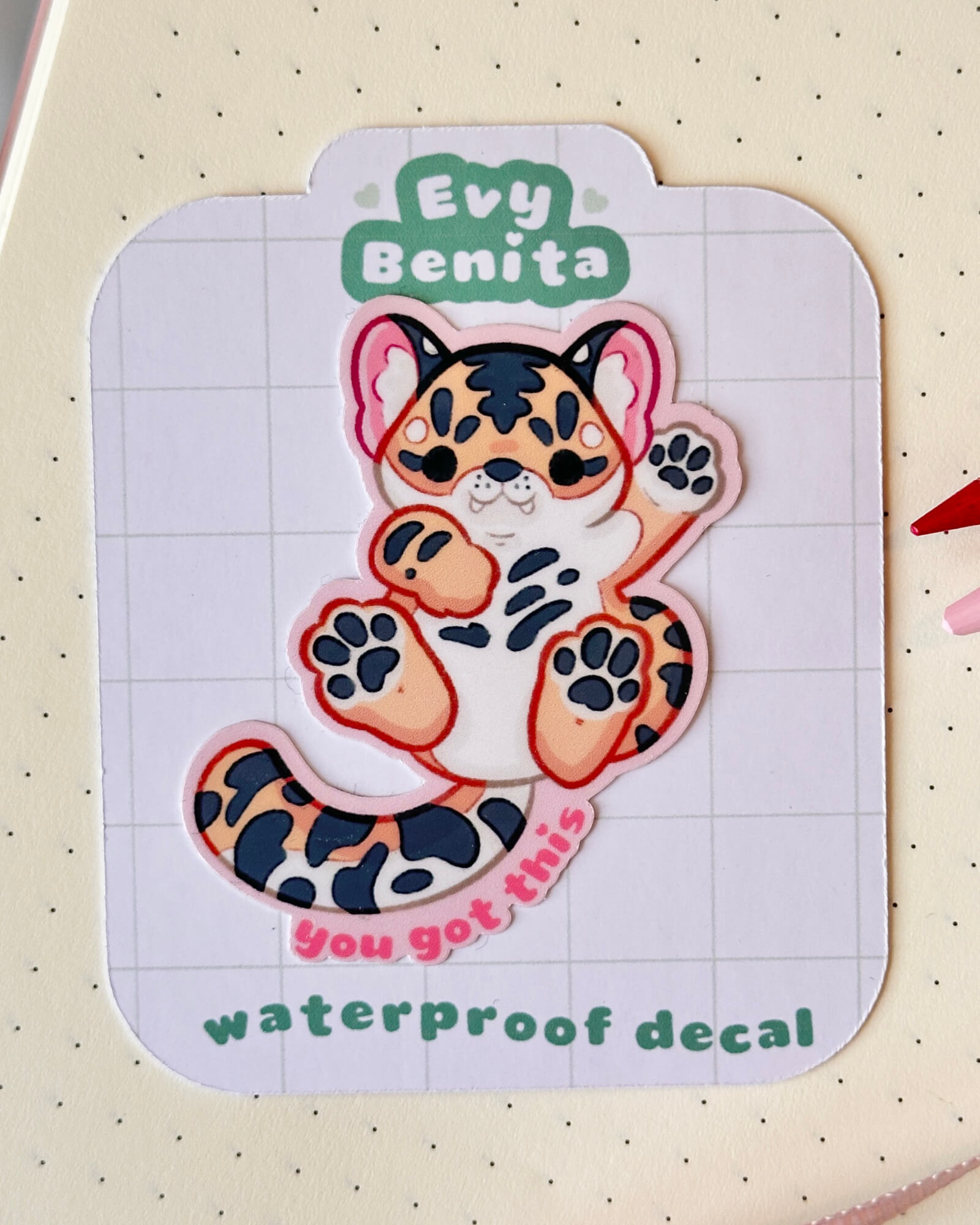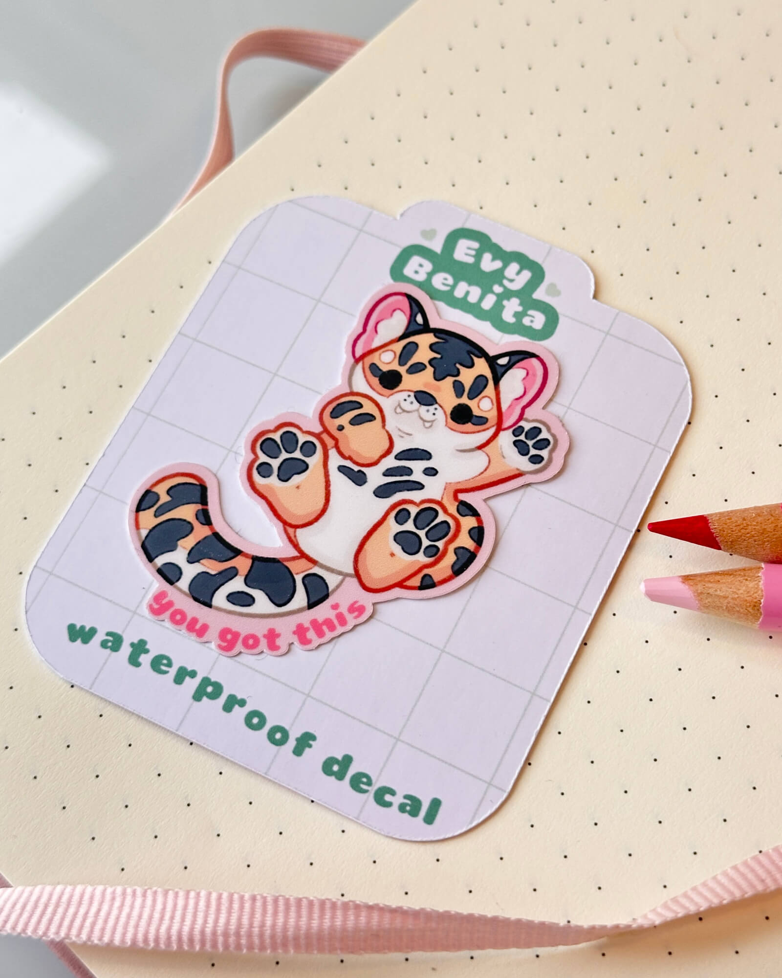 A super cute water-resistant die-cut sticker featuring the You Got This Tiger. Illustrated by Evy Benita. This sticker is approximately two inches on the longest side.