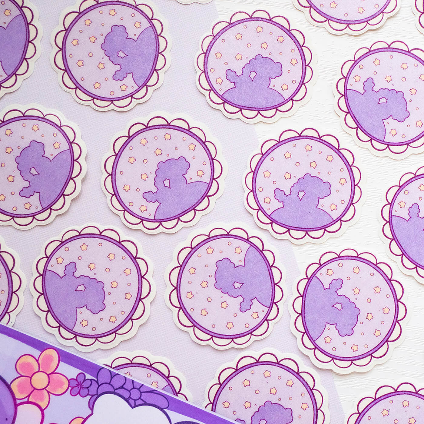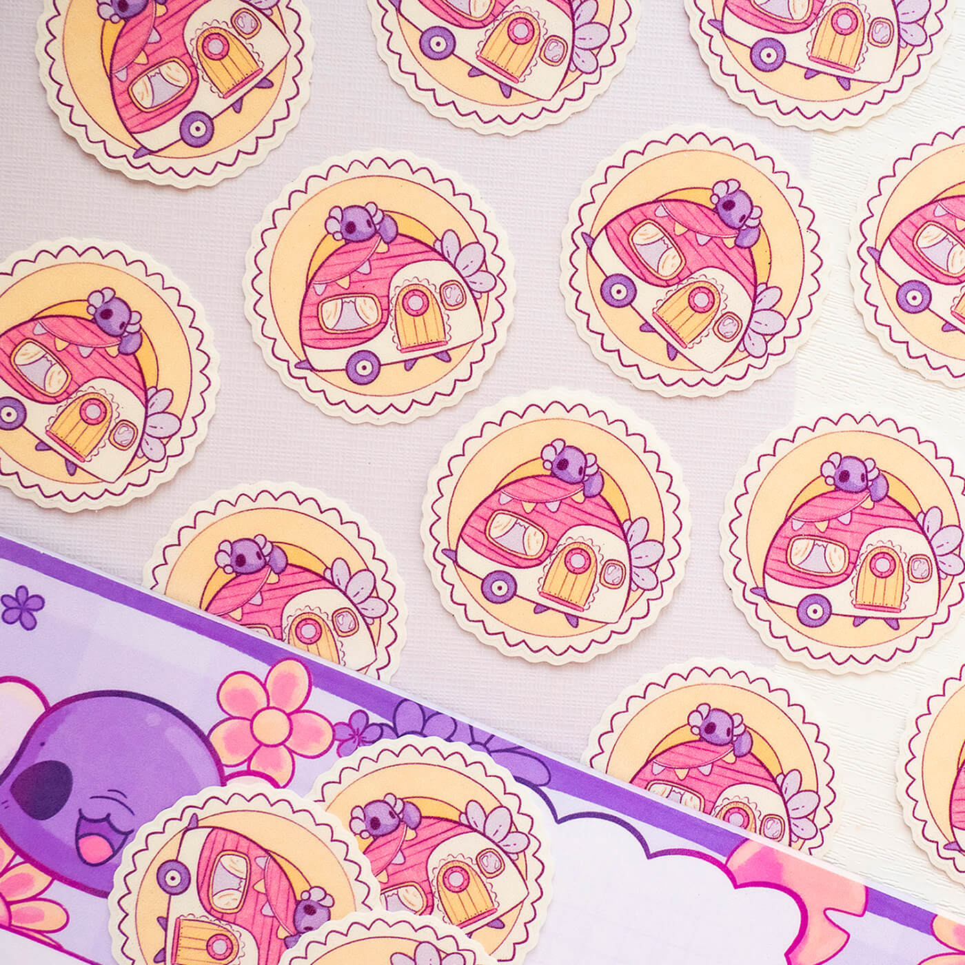 An adventurous sticker pack containing three unique stickers of Luna the Lotl! The stickers are made from clear vinyl, and are ideal for decorating your reusable water bottles and tea tumblers. One sticker shows Luna waving hello to you, backed by lush foliage. The second sticker shows a silhouette of Luna and Noodibun watching a starry sky together. The third sticker shows Luna napping (as Luna does) on top of a Noodibun caravan. Where will you stick yours?