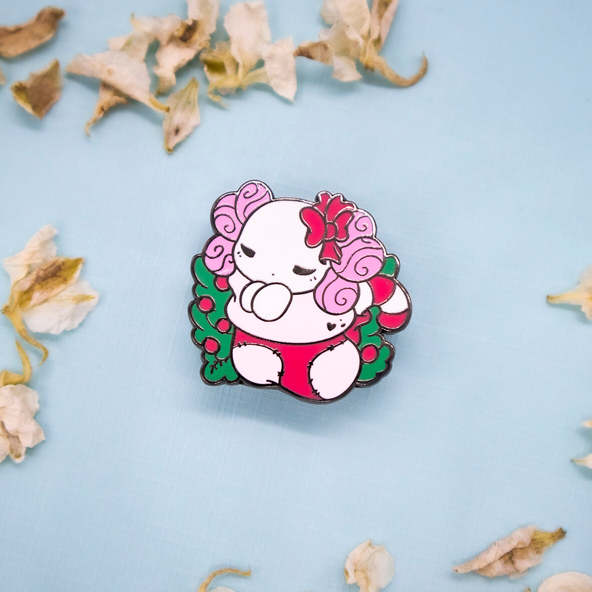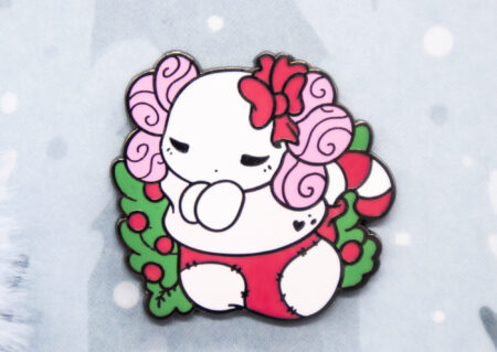 The sweetest little holiday stocking pin featuring Lottie the Lotl, here to bring you ALL the festive feels! This enamel pin is made from hard enamel and plated with lovely, dark black nickel plating. The pin’s color palette takes on the classic “Yule” aesthetic of cranberry red and pine tree green.