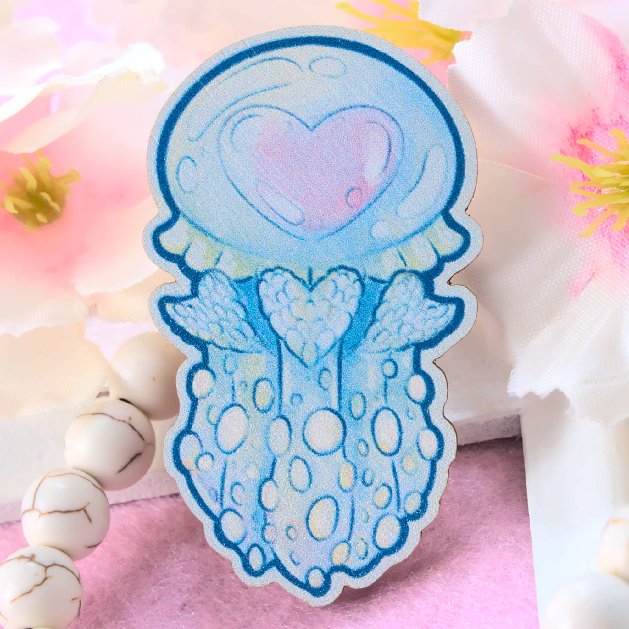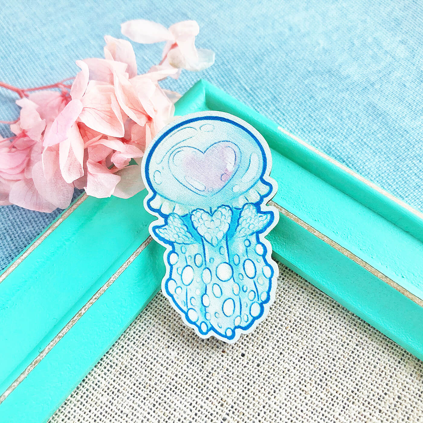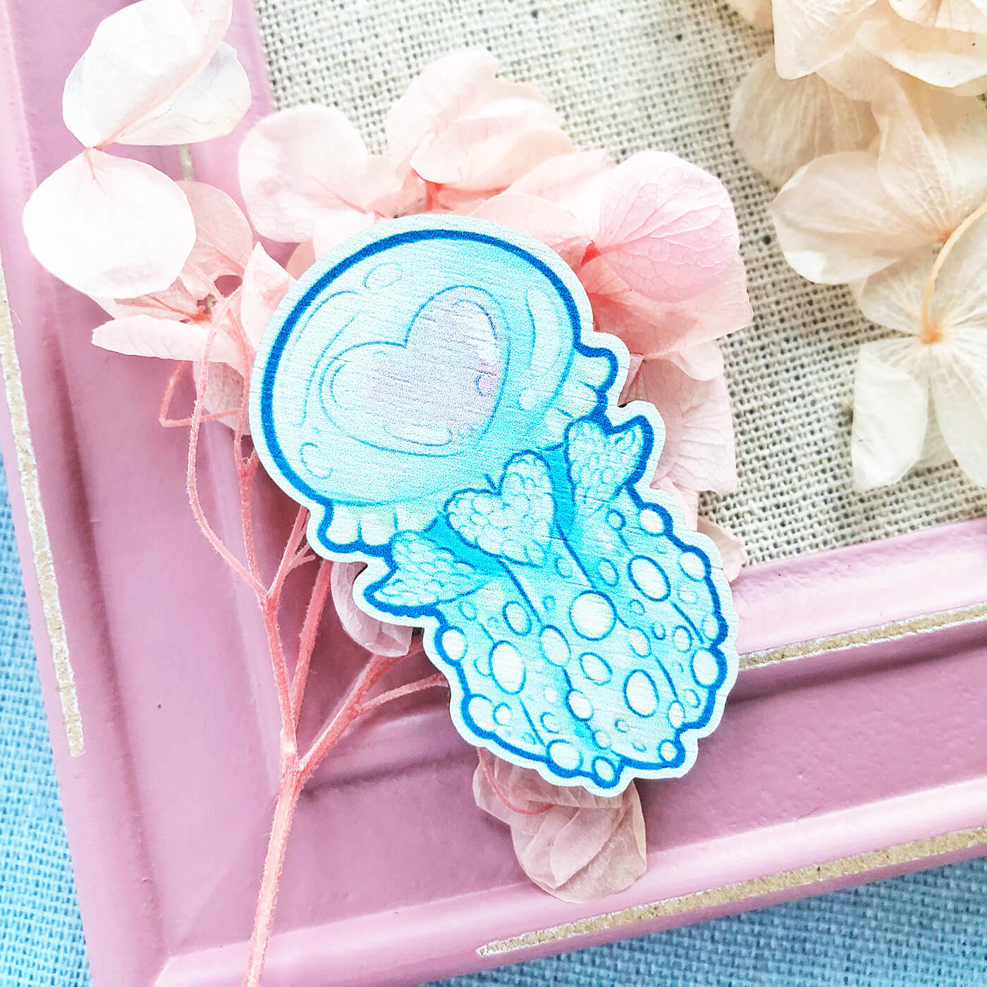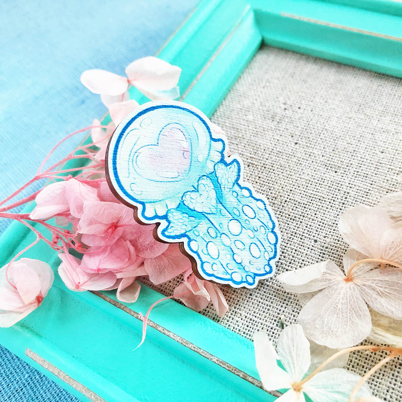 A wooden pin made from sustainably sourced European Birchwood, featuring the Lagoon Jellyfish from the Indo-Pacific Oceans.