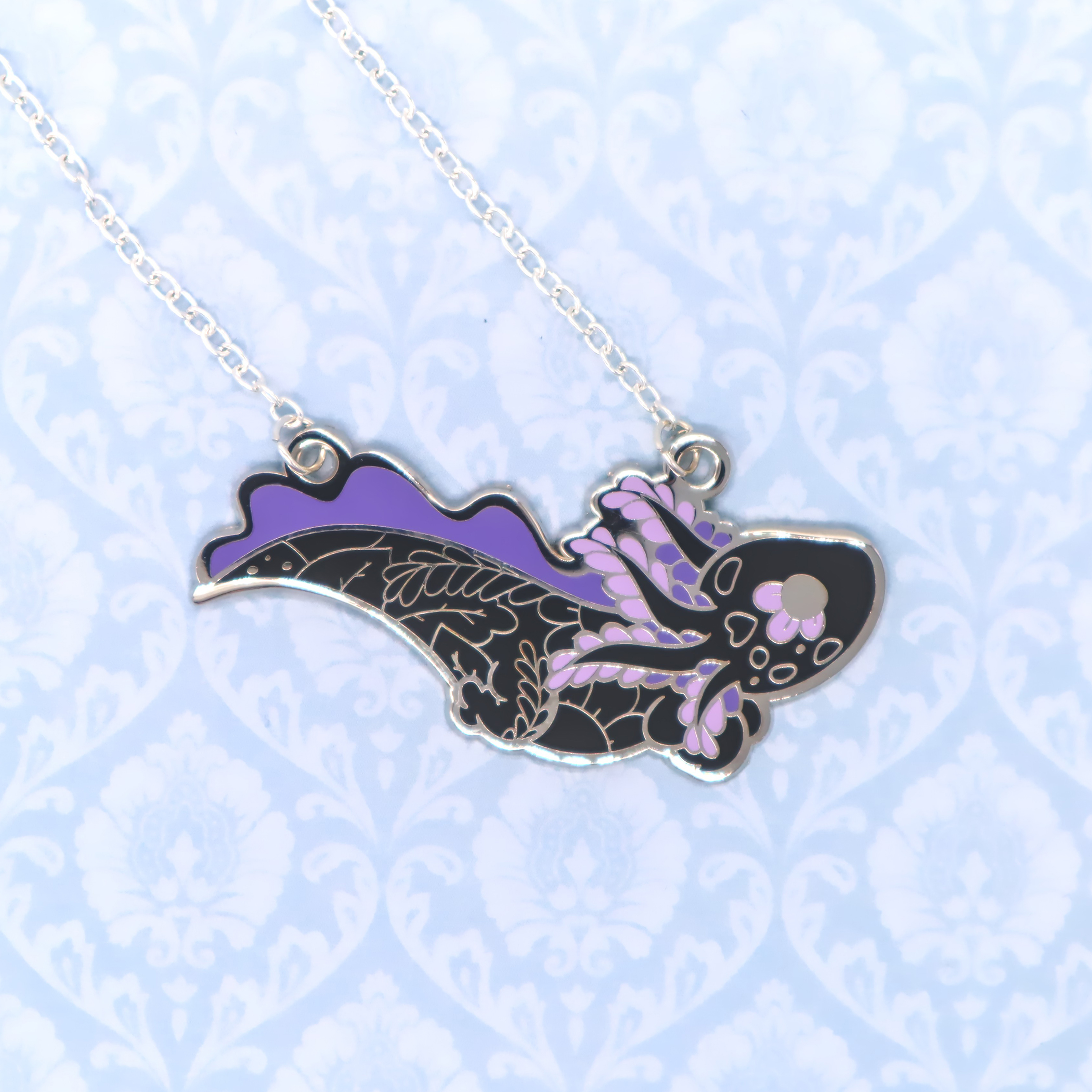 This tranquil enamel necklace pendant features the Melanoid Axolotl: a freshwater salamander native to Mexico City. The pendant is made with a silver-plated brass base and filled with hard enamel. The silver plated chain is made from zinc alloy, and although it is nickel-free by industry standards, it might still contain traces of nickel. Thus, I would NOT consider it hypoallergenic.
